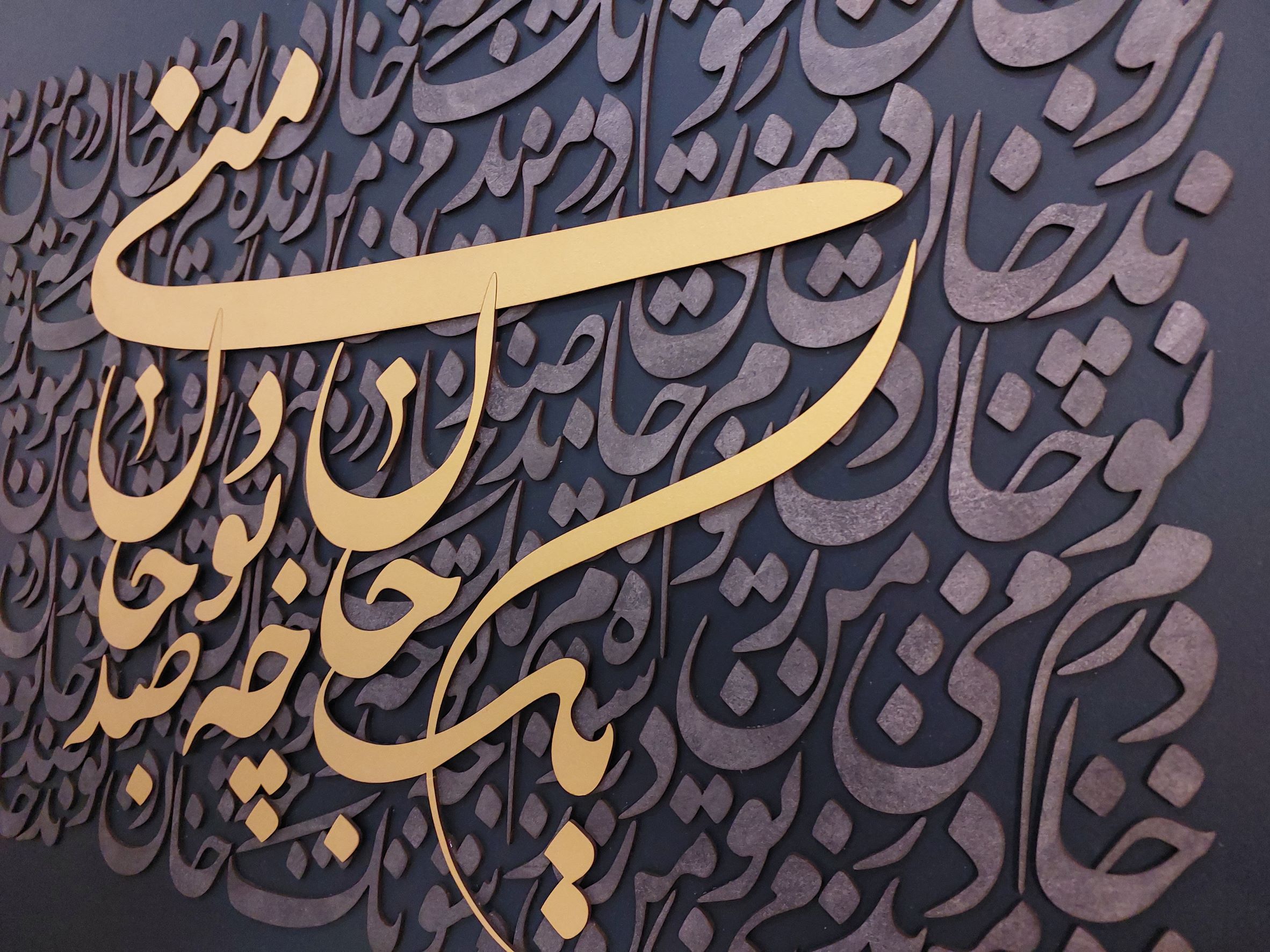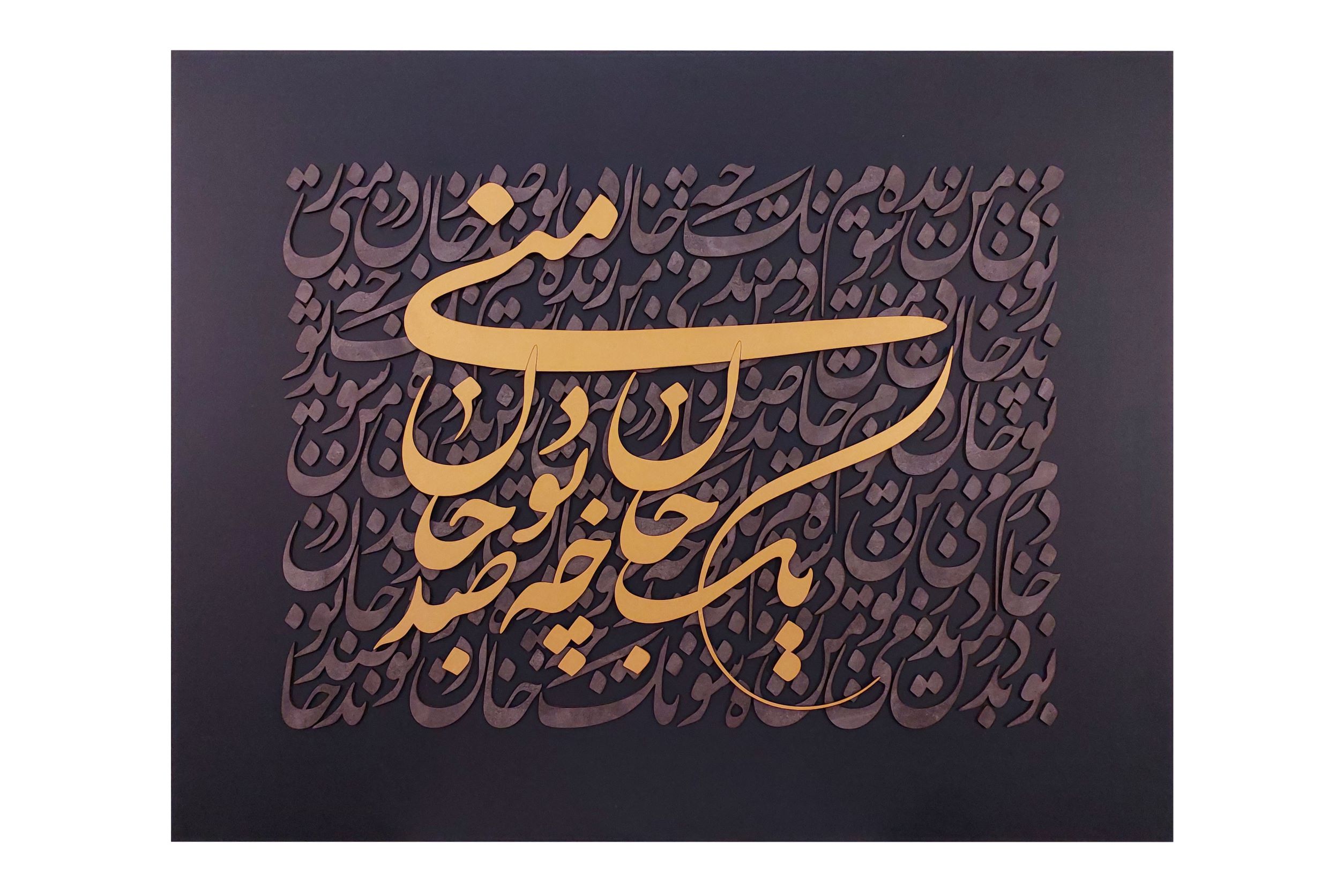 تابلوی کالیگرافی با متن «یک جان چه بود صد جان منی»، با ترکیب رنگهای سبز یشمی، طلایی و پتینه نقره، زیبایی و عمق خاصی را به نمایش میگذارد.