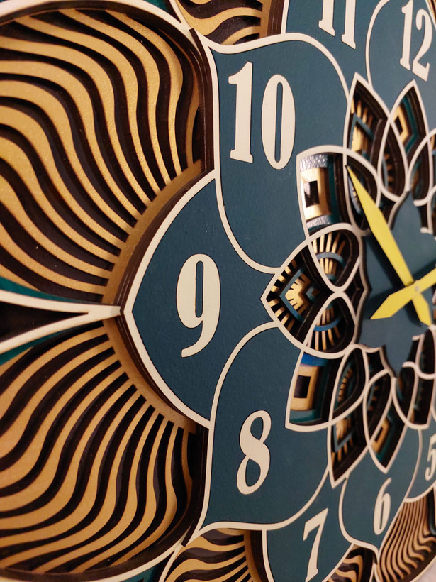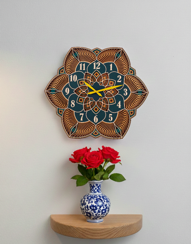 ساعت دیواری چوبی کد ۲۰۱۲ یک قطعه دکوراتیو هنری است که با استفاده از تکنیک معرق و چوبهای چند لایه ساخته شده و شکلی شبیه به یک ماندالای گلدار دارد. این ساعت با ابعاد ۶۰ در ۵۲ سانتیمتر و وزن 2 کیلو و 300 گرم، دارای ترکیب رنگی چشمنواز شامل سبز، طلایی و کرم است که به فضای شما عمق بصری میبخشد. از نظر فنی، این ساعت مجهز به موتور تایوانی آرامگرد است که عملکردی بیصدا و مطمئن را برای استفاده در محیطهای خانگی تضمین میکند.