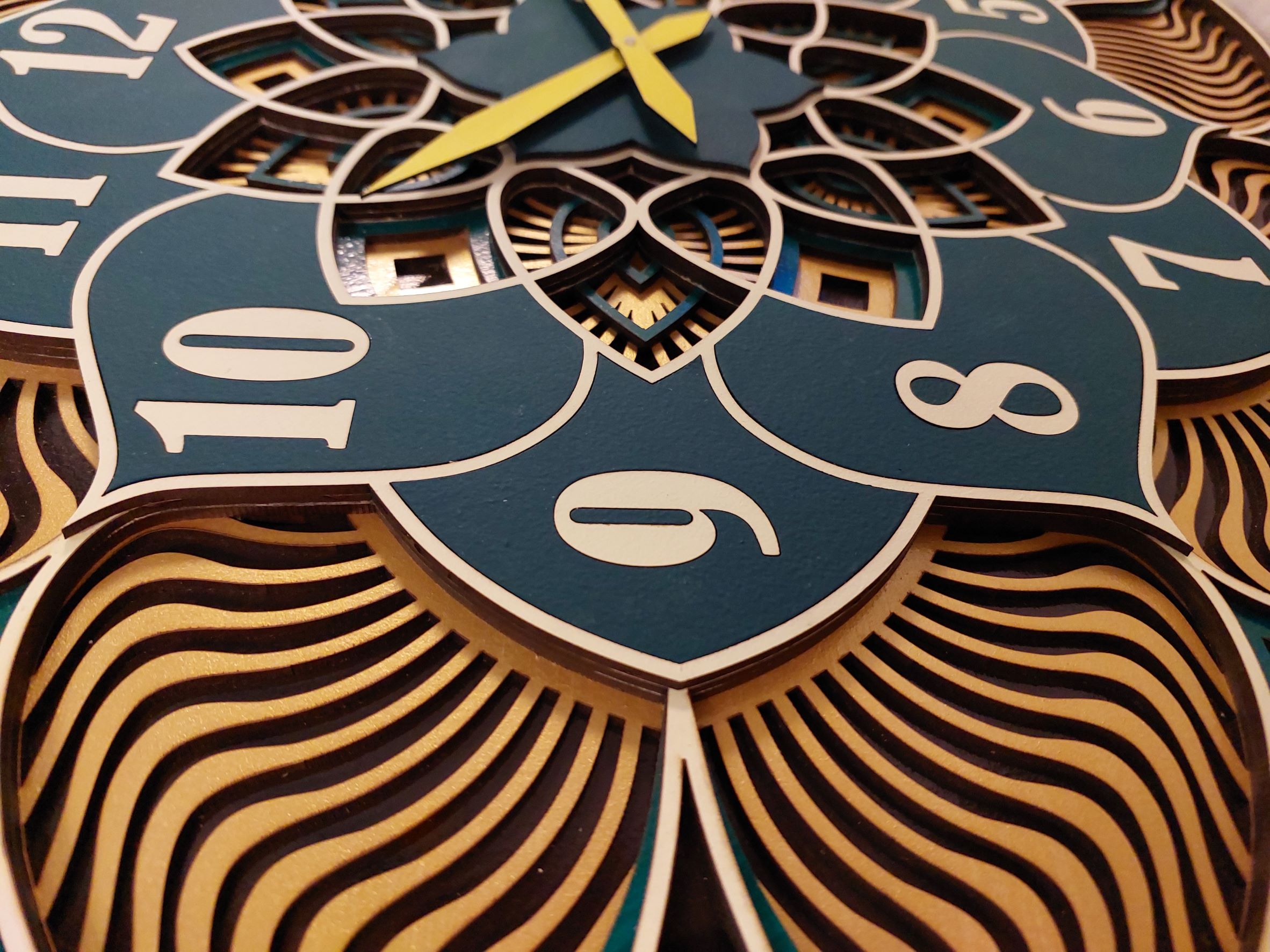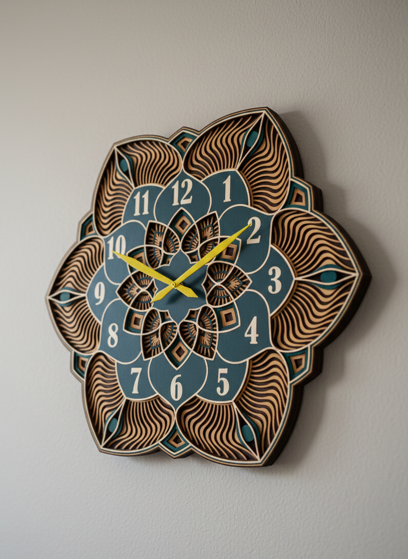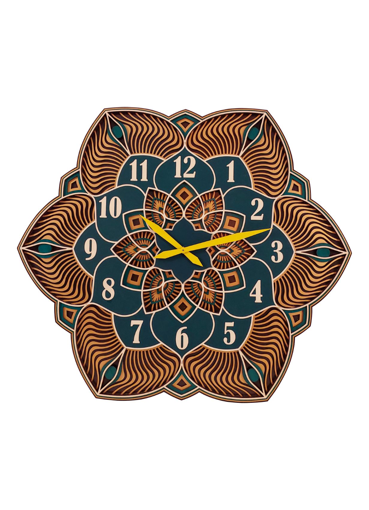 ساعت دیواری چوبی کد ۲۰۱۲ یک قطعه دکوراتیو هنری است که با استفاده از تکنیک معرق و چوبهای چند لایه ساخته شده و شکلی شبیه به یک ماندالای گلدار دارد. این ساعت با ابعاد ۶۰ در ۵۲ سانتیمتر و وزن 2 کیلو و 300 گرم، دارای ترکیب رنگی چشمنواز شامل سبز، طلایی و کرم است که به فضای شما عمق بصری میبخشد. از نظر فنی، این ساعت مجهز به موتور تایوانی آرامگرد است که عملکردی بیصدا و مطمئن را برای استفاده در محیطهای خانگی تضمین میکند.
